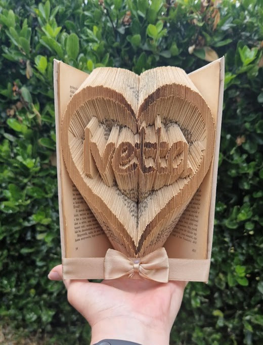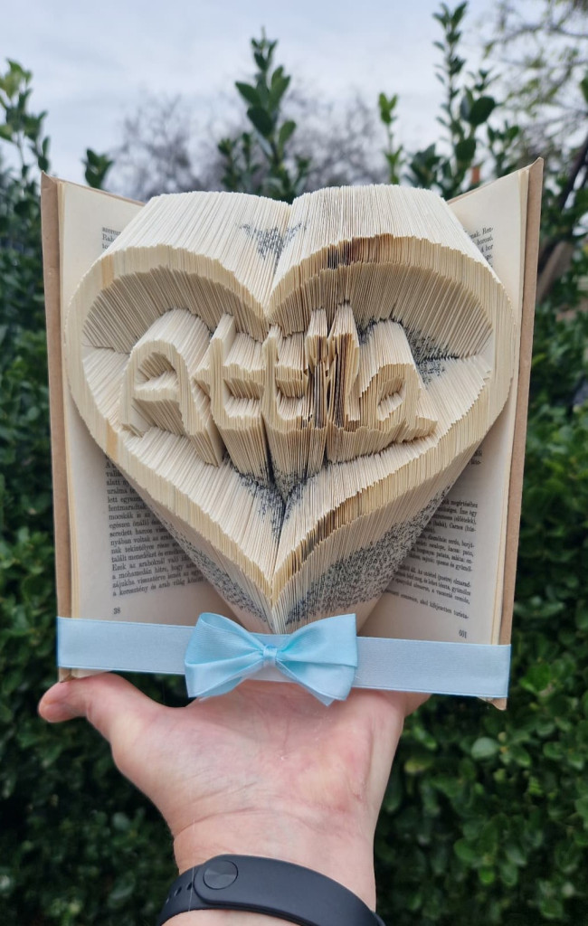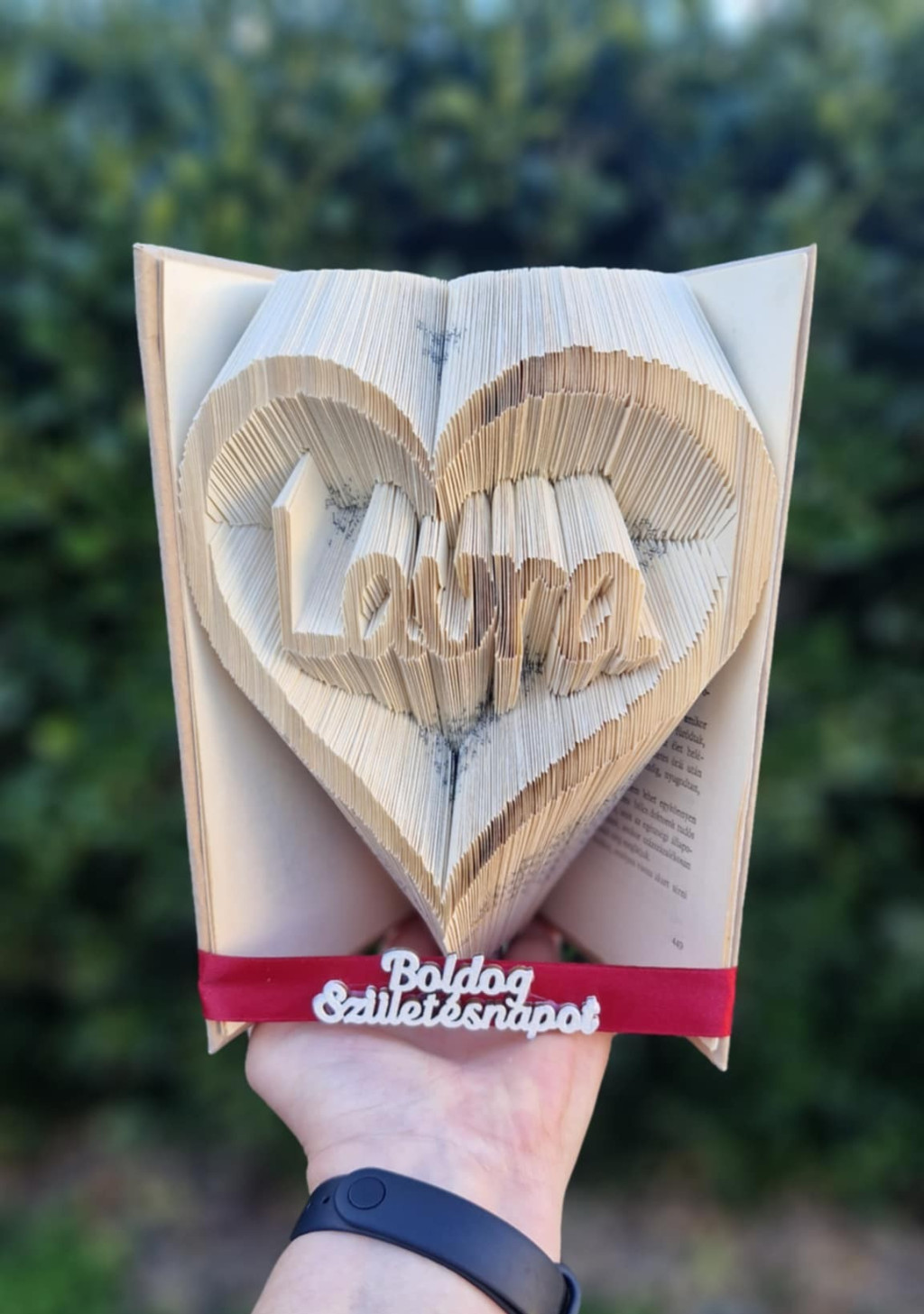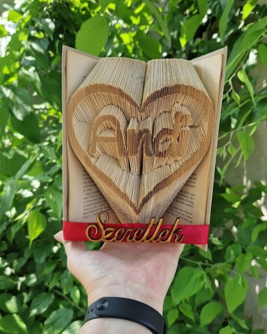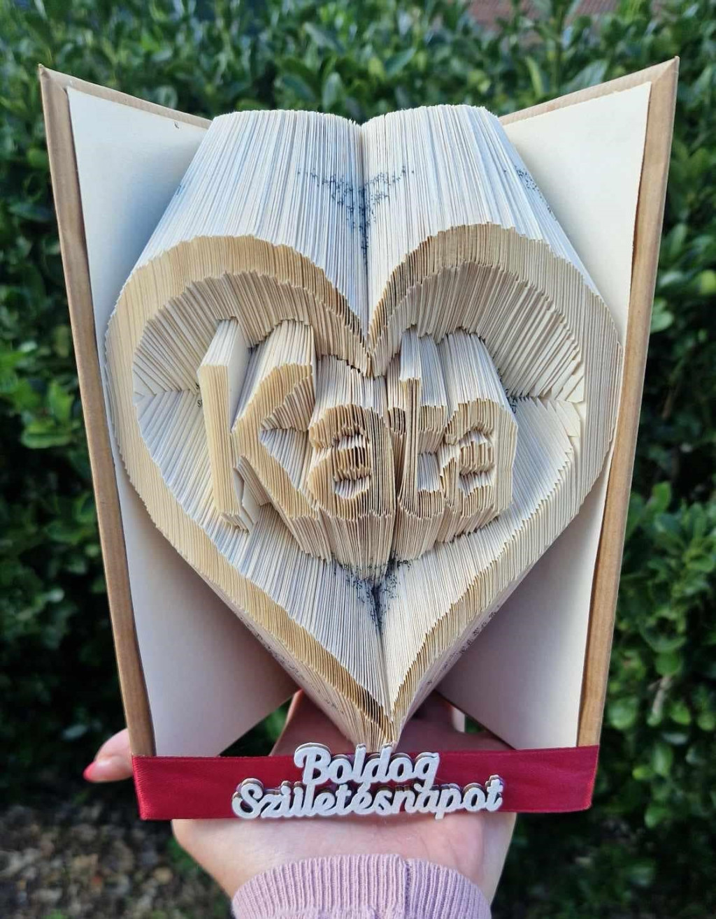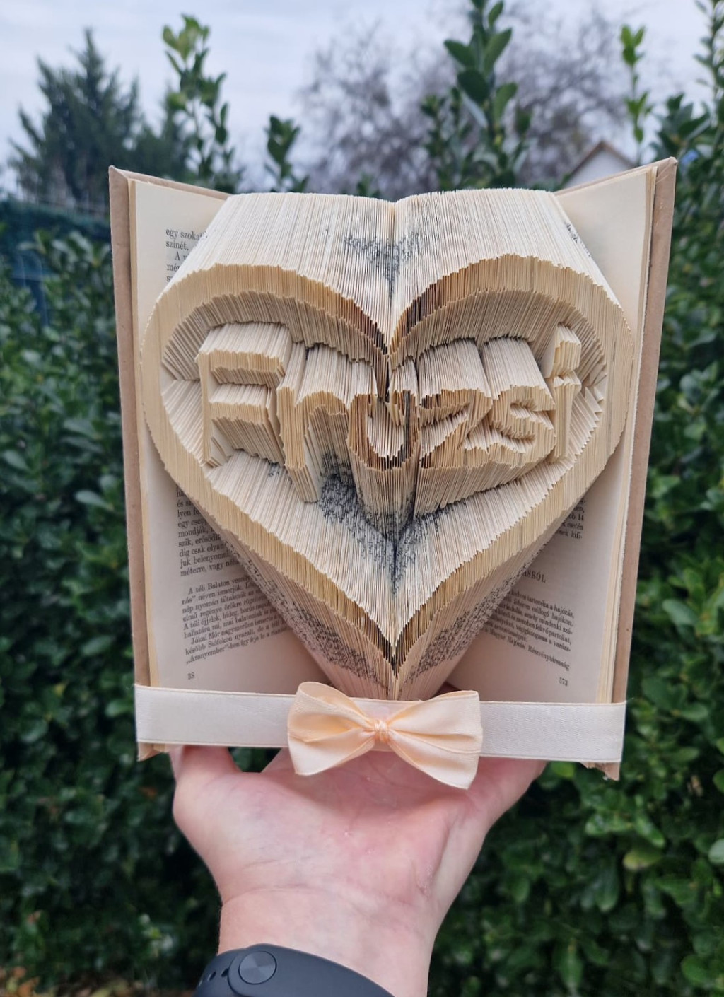 Adj új életet egy régi könyvnek! Könyvszobraim kidobásra szánt könyvekből készülnek, amelyeket gondosan, kézzel hajtogatva alakítok egyedi műalkotásokká. A vásárlók által megadott nevet, dátumot vagy egyedi szöveget formálom meg a könyv lapjaiból, így minden darab teljesen személyre szabható és egyedi.